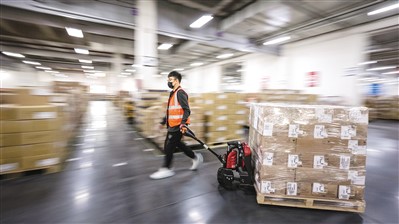 在中免海南國際物流中心,裝卸員轉(zhuǎn)運(yùn)剛卸下的免稅品。這里存放成千上萬件的免稅品,要形成一個安全、快速的查驗(yàn)放行閉環(huán)。