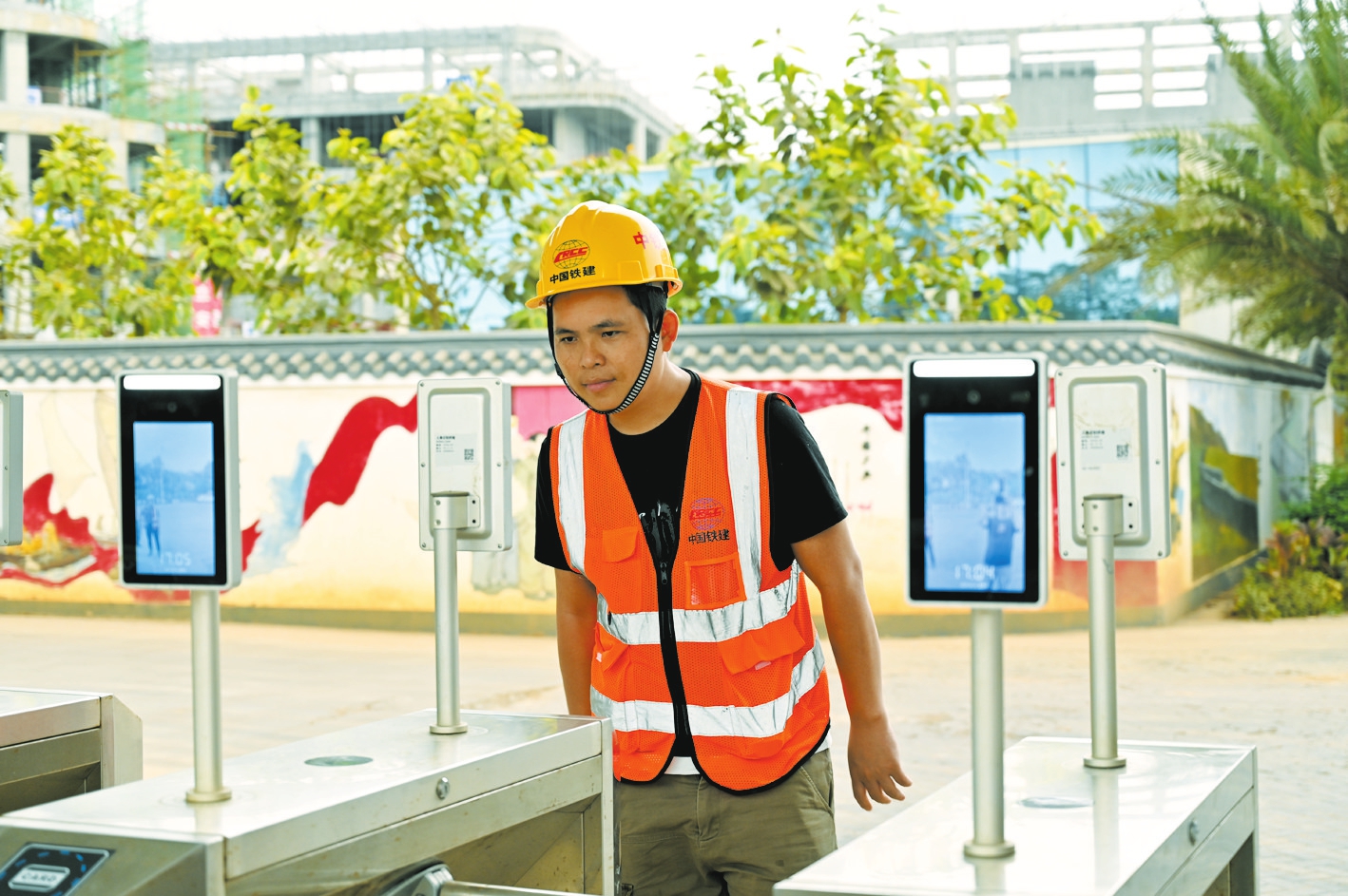 海南醫學院第一附屬醫院江東新院區項目現場,工人通過刷臉通行。