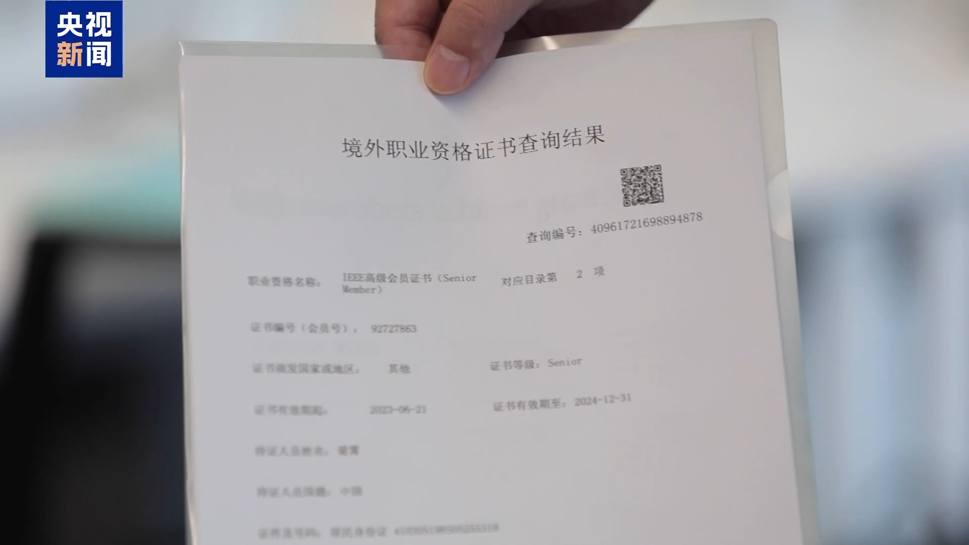 梁霄此前在美國取得了電氣與電子工程師協(xié)會的高級會員證書。最近,這張證書被認(rèn)證為國內(nèi)的副高級職稱,幫助他獲得了心儀的崗位。